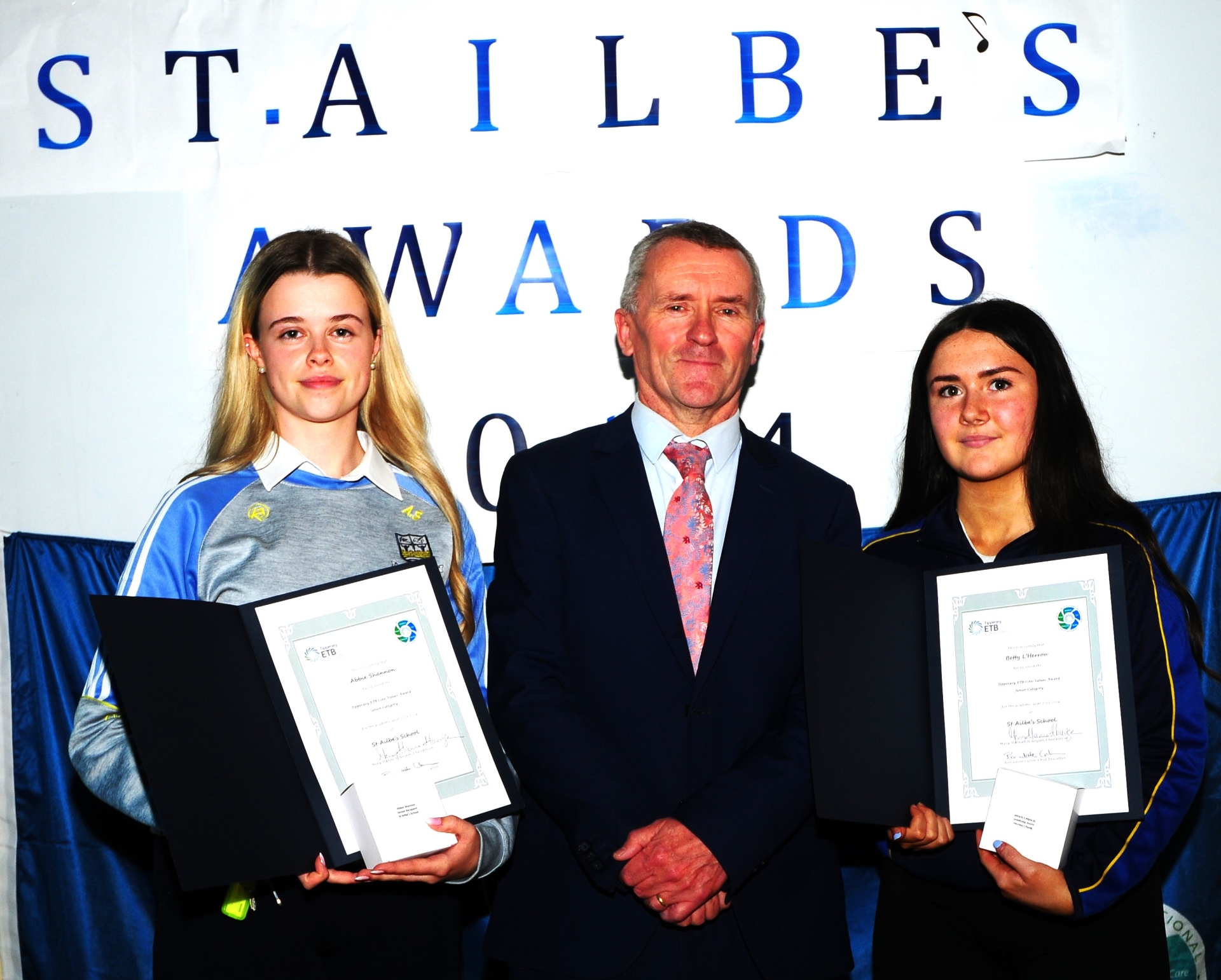 Abbie Shannon 6th Year and Betty L'Herrou 3rd year, receiving their ETB Core Value Awards from Deputy Principal Mr. Kieran O'Dwyer.