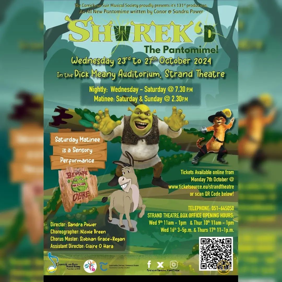 The hilarious pantomime based on the famous animated movie character Shrek will be staged at the Strand Theatre in Carrick-on-Suir from Wednesday, October 23 to Sunday, October 27 inclusive.