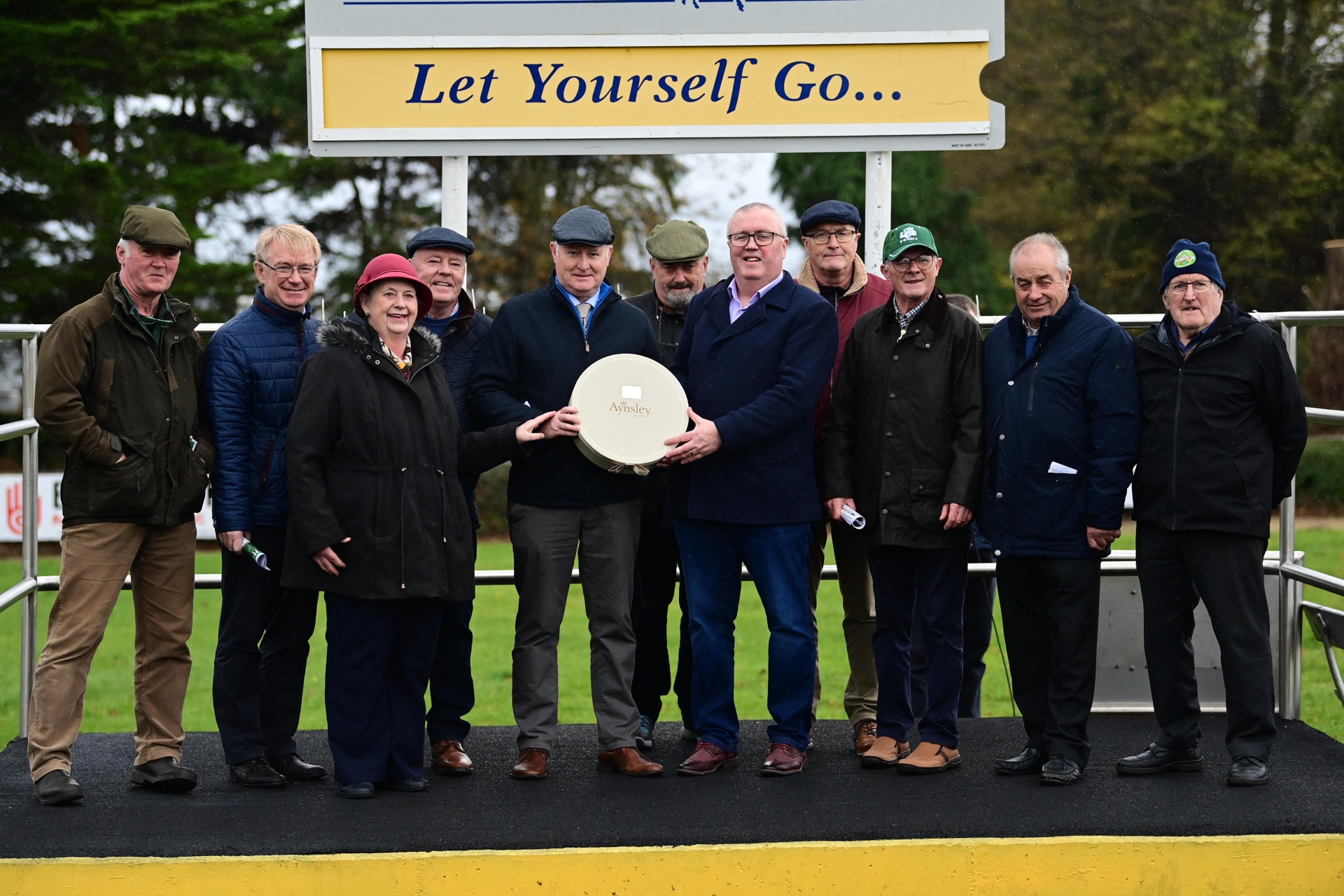 Caption for picture above: Members of the Whitegrass Racing Syndicate receiving a trophy from DJ Histon, Manager of Clonmel's Powerstown Park Racecourse following the success of the Willie Mullins trained, Straight Home, in the Kilclooney Woods Handicap Hurdle at Clonmel last Thursday, October 24.