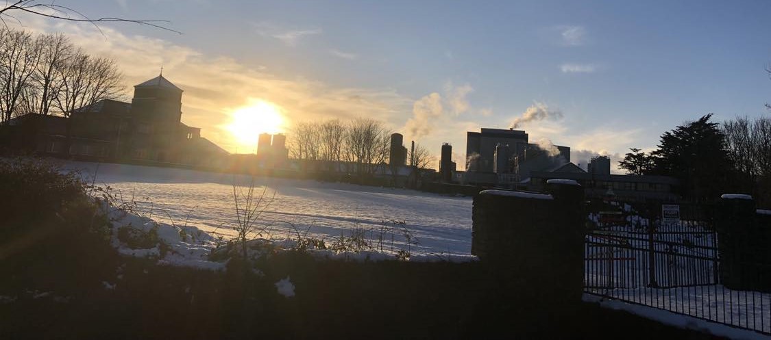 The evening sun at the snow covered Abbey School in Tipperary Town