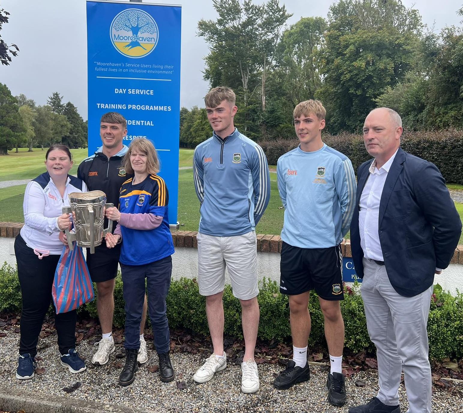 Moorehaven service users with the Liam McCarthy Cup along with Johnny Ryan, Adam Ryan, David Ryan and Liam Cahill at the Moorehaven Golf Classic