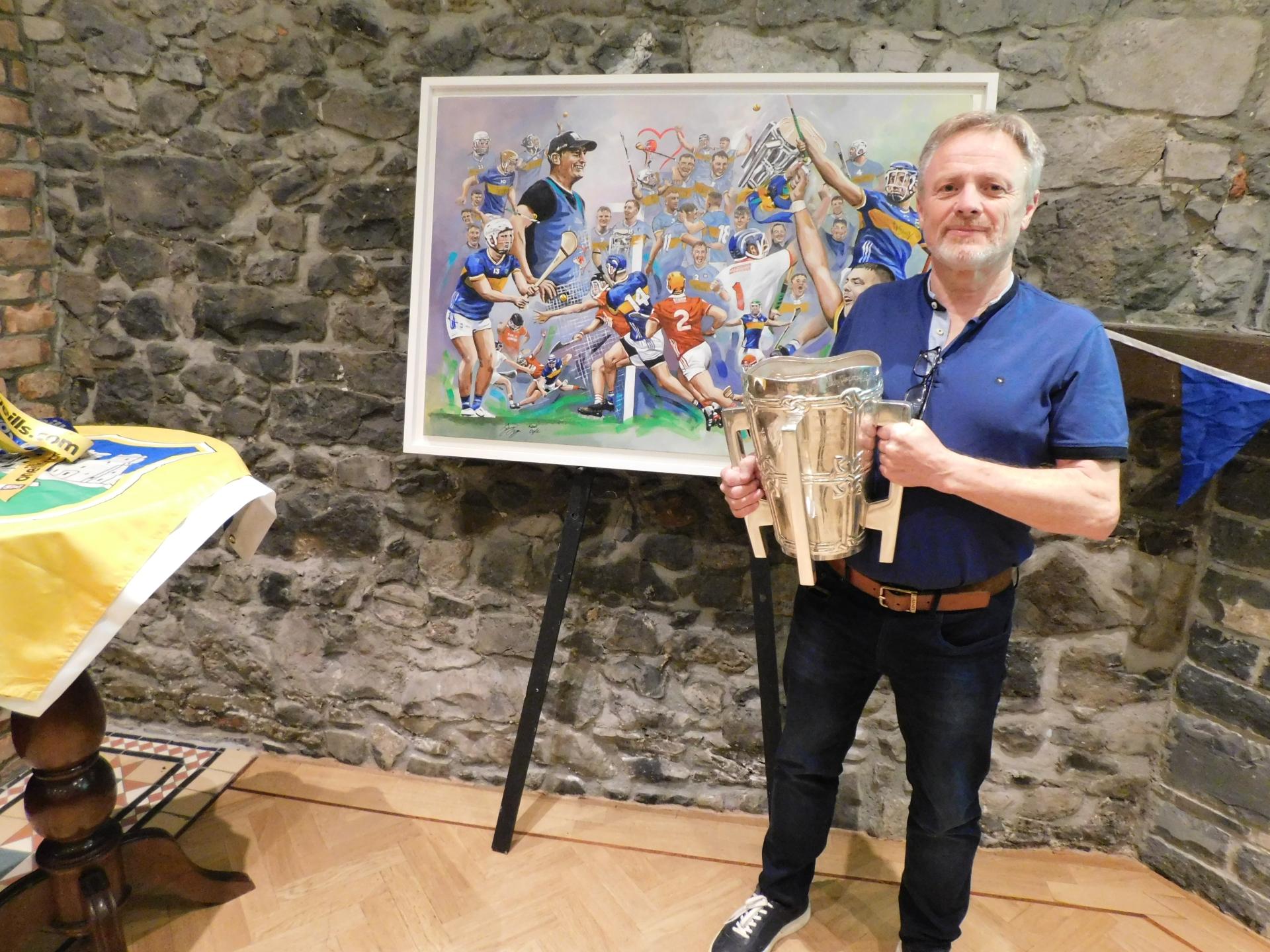Artist Neil O'Dwyer in front of his painting and holding the Liam MacCarthy Cup at the celebration night at the Porter House.