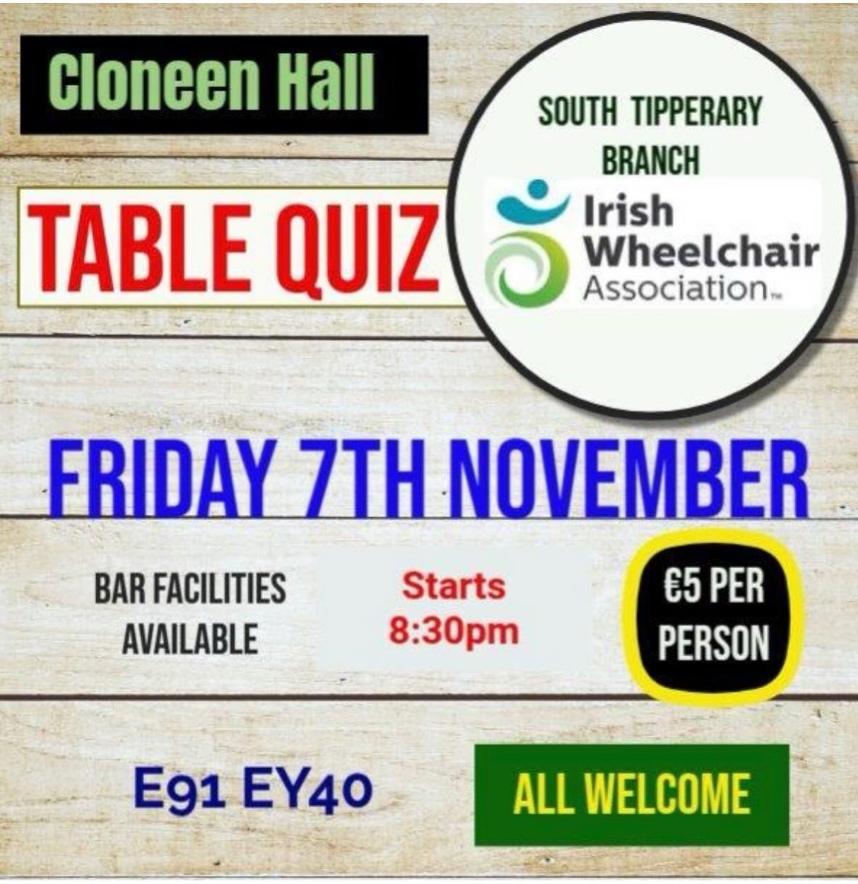A table quiz in aid of the South Tipperary branch of the Irish Wheelchair Association will take place in Cloneen Hall in Cloneen village on Friday, November 7 at 8.30pm.