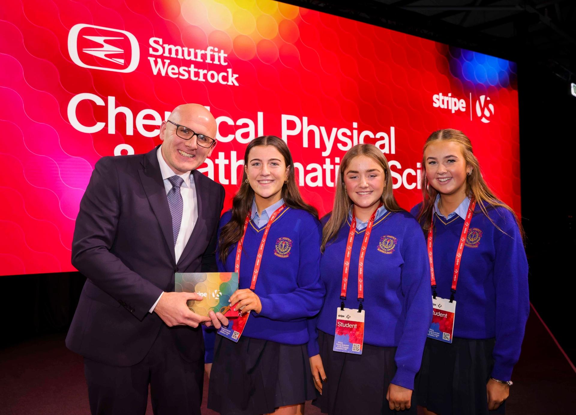 Chemical, Physical & Mathematical Sciences presented by Smurfit Westrock.Ray McGrath, Chair of the Judging Panel from Stripe, presents the 2nd Intermediate Group Award to Anna Meehan, Aoibhe Hassett and Lucy Rabbitte, from St Joseph’s College, County Tipperary, for the project “An Investigative Study into How Landing Techniques in Different Sports Affect Strains on the ACL in Athletes.”