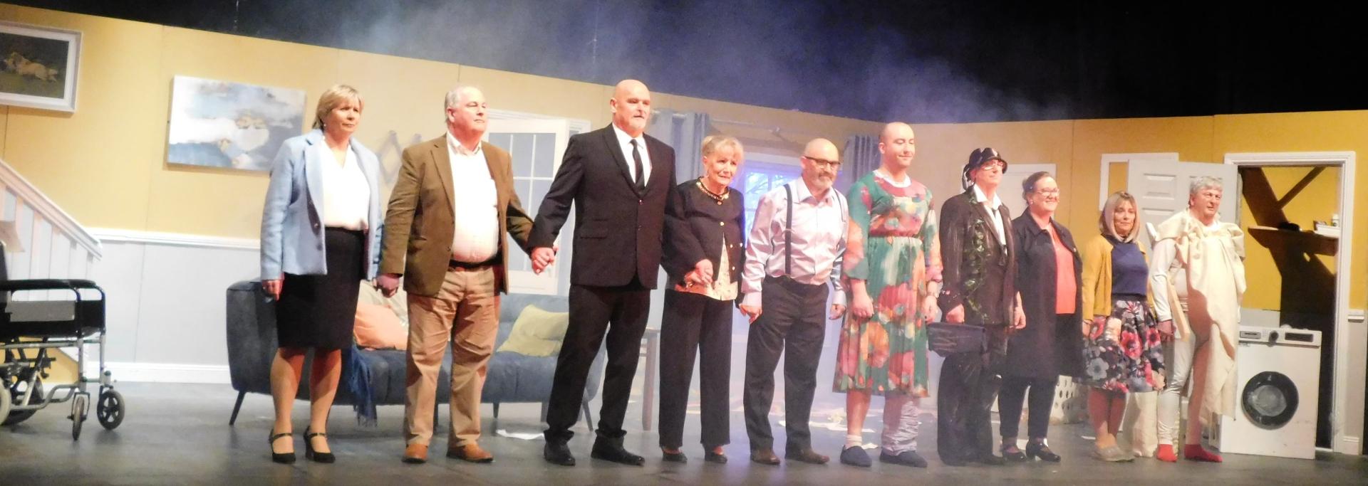 Taking a bow at the conclusion of a night of mayhem in Cash on Delivery are the cast of The Forge Players.