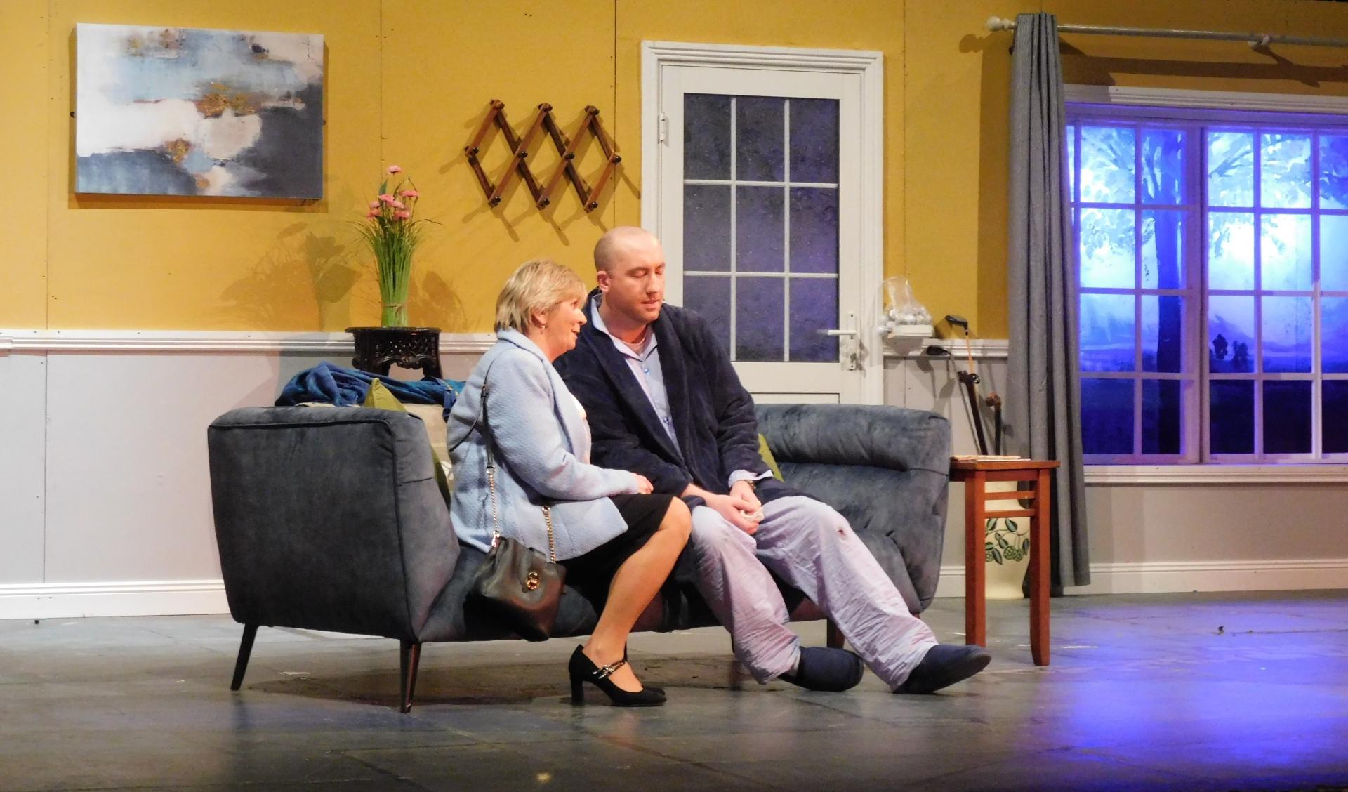 Sally Mooney (Anne Noonan) shares a quiet word with Norman Barry (Eoghan Ryan) in Cash on Delivery by The Forge Players.