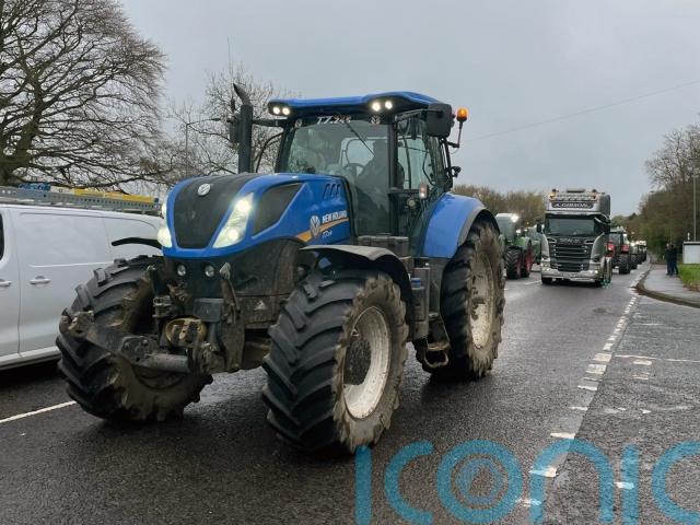 Martin Downey, a beef farmer from Dromore in Co Down, rode his bike at the head of a slow-moving convoy of tractors and trucks as it passed along the A1 near the village of Hillsborough on Tuesday.