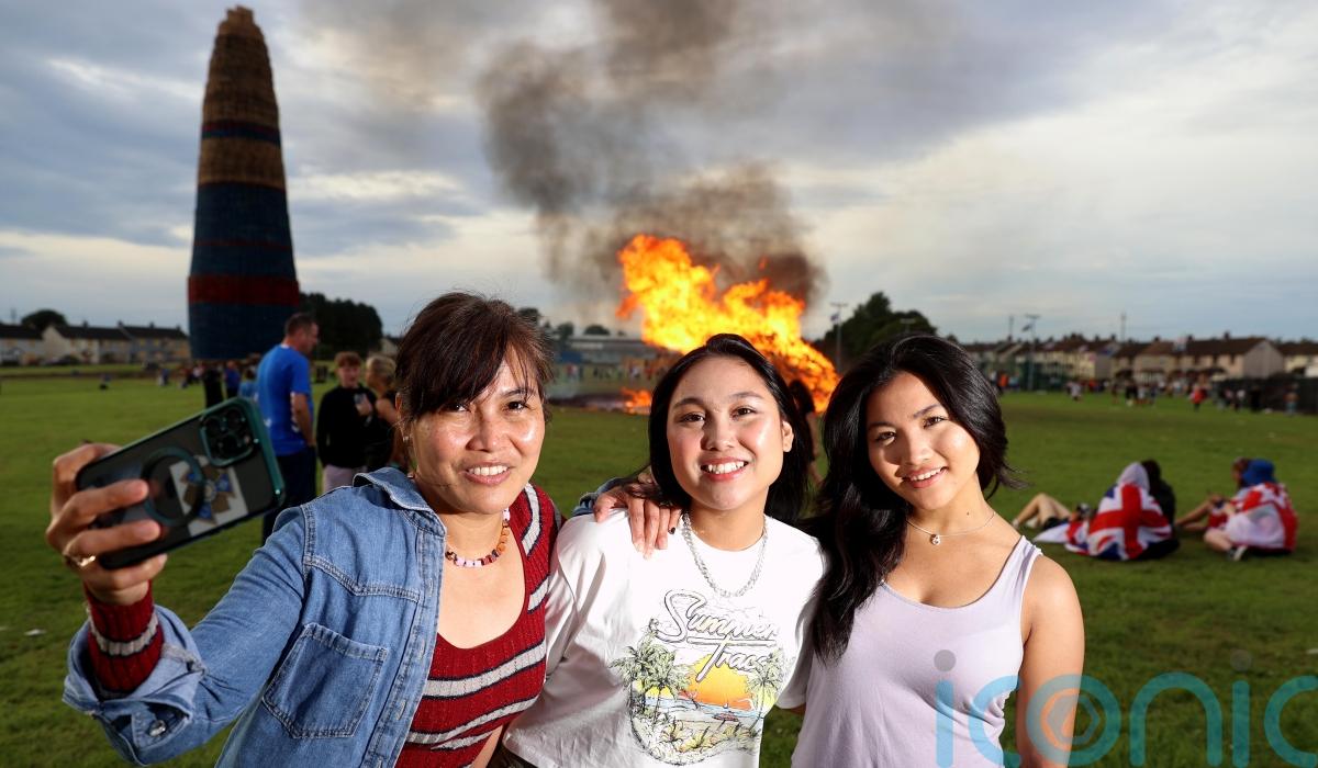 A number of the pyres, mainly constructed by stacking wooden pallets, were set alight late on Monday evening with the rest to be ignited at midnight.