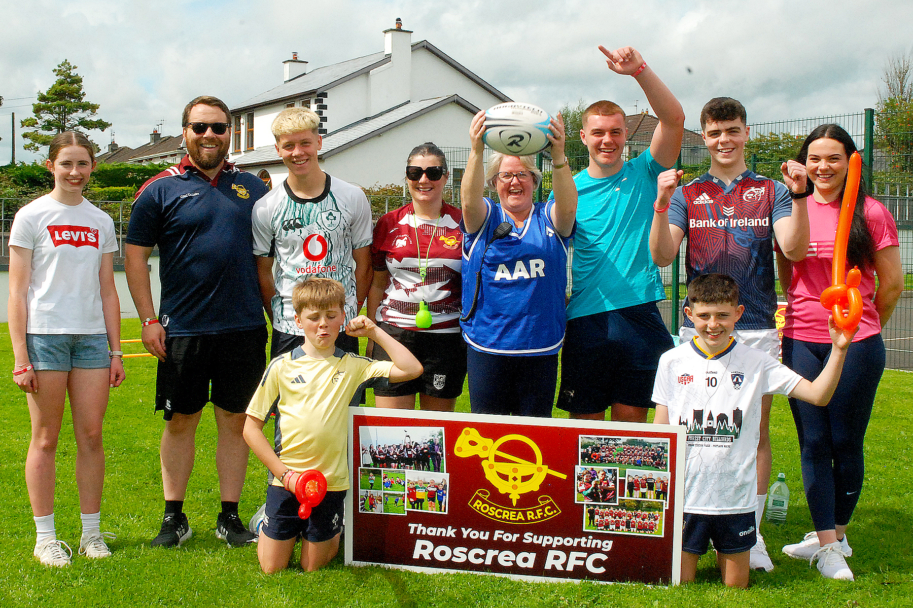 Pictured are members of Roscrea Rugby Club's Jedi Group s with Marguerite Ryan, Autsim Awareness Roscrea's lead Coordinator. Photo: PJ Wright