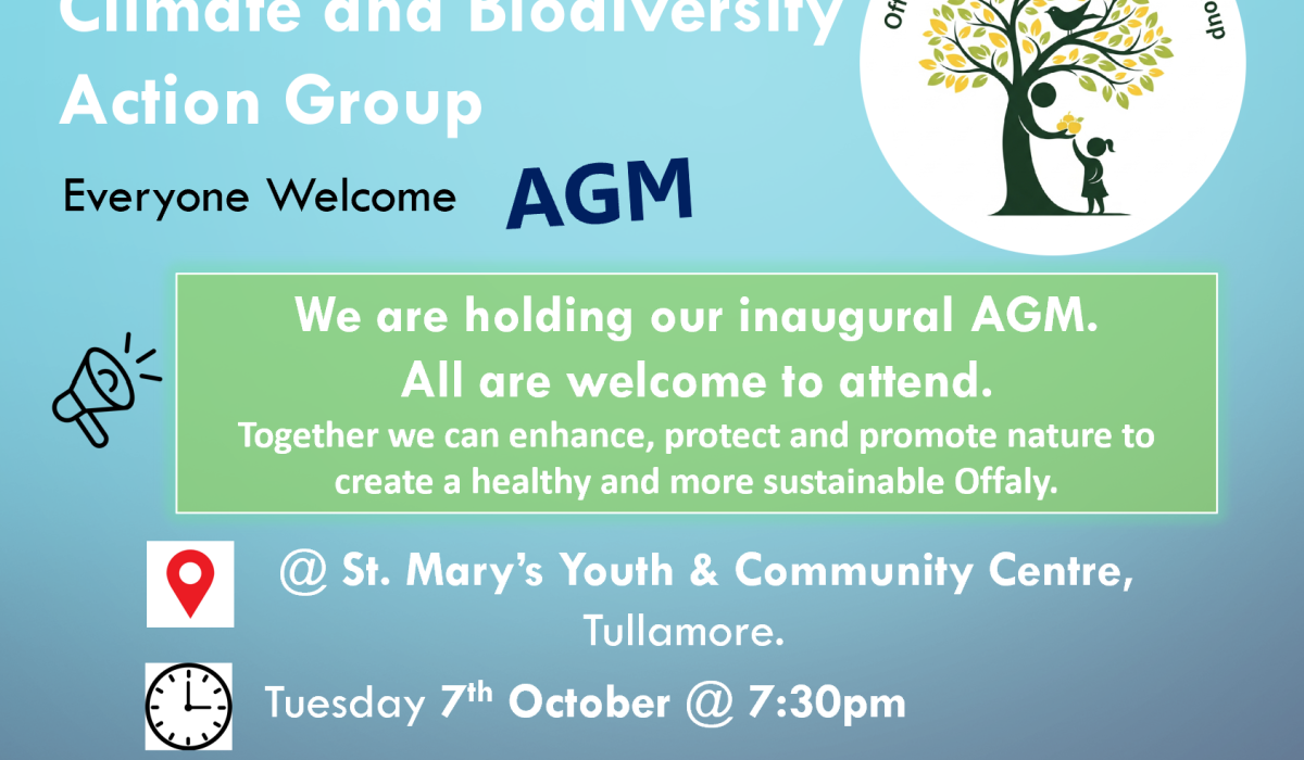 The Offaly Climate and Biodiversity Action Group (OCBAG) will hold its inaugural Annual General Meeting (AGM) this evening, Tuesday, 7 October at 7.30pm. in St Mary’s Youth Centre, Tullamore.