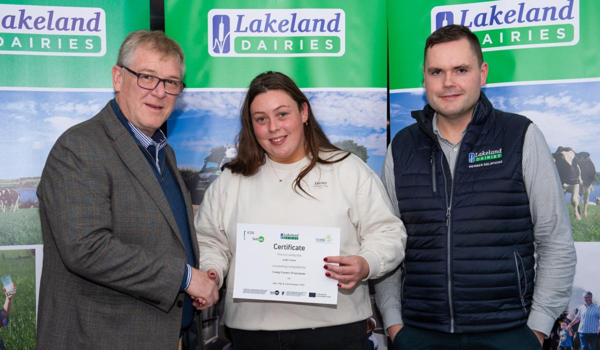 Pictured L-R: Billy Goodburn, Head of Learning & Development, ICOS, Aoife Clarke and Eamon Duignan, Member Relations Manager Lakeland Dairies