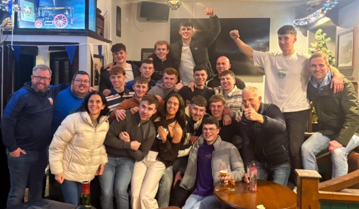 Tullamore senior football star, Cillian Bourke (back centre), pictured with some family and team mates on Saturday night in Paddy’s Bar, High St, before he headed to the airport to begin his next sporting chapter in Essendon, Melbourne as an AFL player.