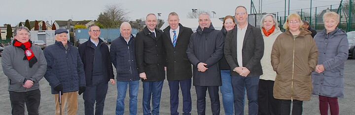 Minister for Rural and Community Development and the Gaeltacht, Dara Calleary TD, pictured with members of Moneygall Development Association and the Moneygall FC during the turning of the sod for the new community Centre (l. to r.); John Hassett, Buddie Powell, Mark Moroney, Gerry Larkin, Henry Healy, Cllr Peter Ormond, Minister Calleary, Lisa Costello, Sean Nolan, Theresa Harney, Colette Nolan and Betty Costello. Photo: Rose Mannion.