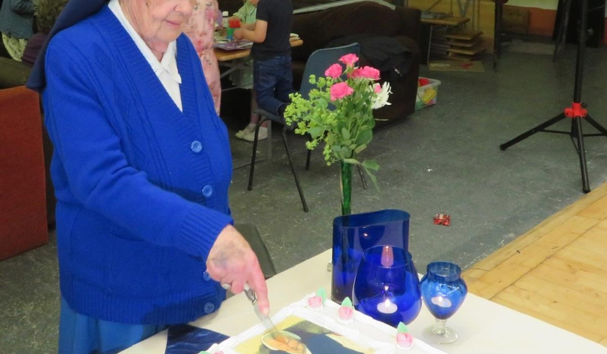 Sr. Immaculata Barrett cutting her 70th anniversay cake of 70 years of service with the Sisters of Mercy