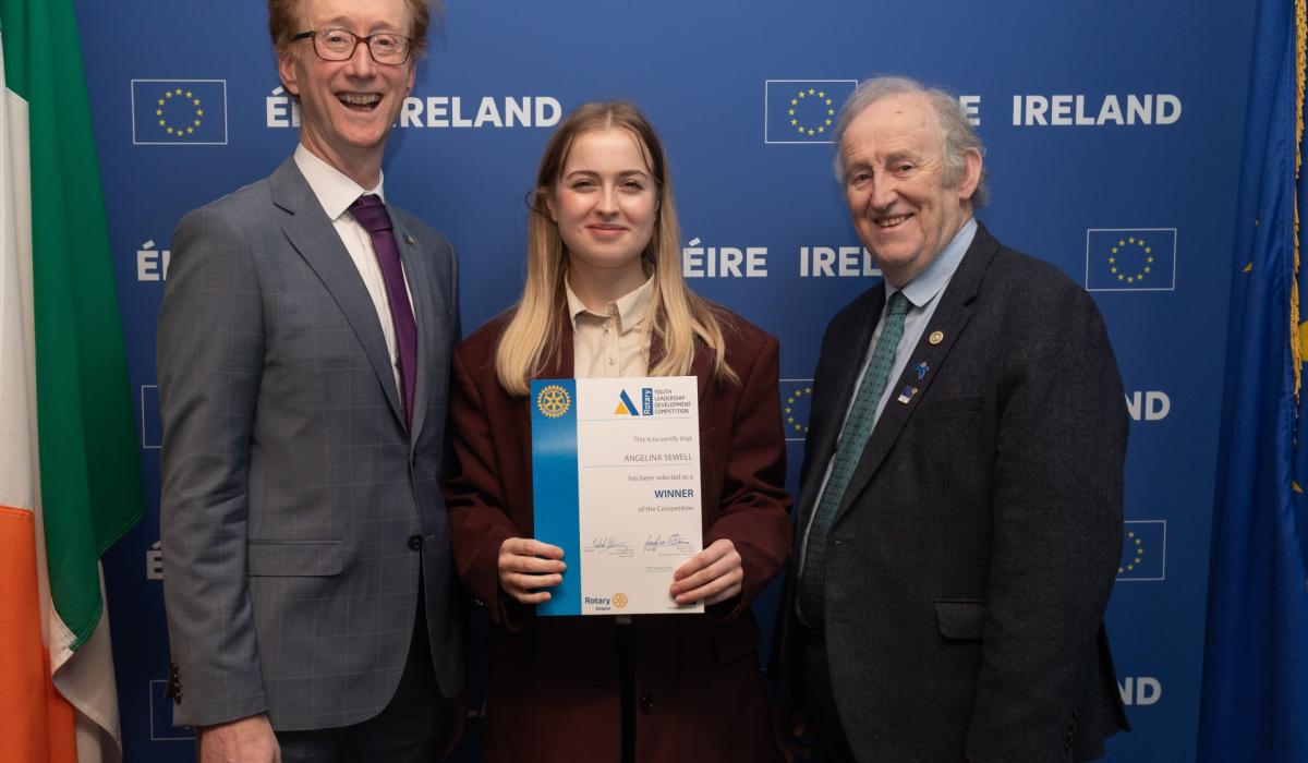 Angelina, who is a fifth-year student at Sacred Heart School Tullamore, received her certificate from Rotary Ireland District Governor, Michael Fleming, and Fearghas Ó Béara, Head of the European Parliament Liaison Office in Ireland.