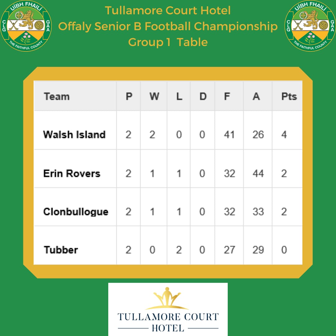 It means that the race for the other two knockout berths from group 1 is red hot. Walsh Island are through with four points while Erin Rovers and Clonbullogue have two each and Tubber are bottom of the table with no points.
