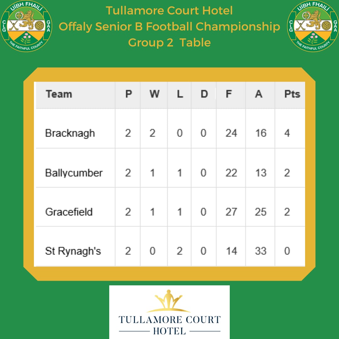 Gracefield had to work hard to beat St Rynagh's by 2-7 to 1-6 in the other group 2 game at the weekend. This means that Ballycumber and Gracefield have two points and both are certain to qualify. Even if St Rynagh's did shock Bracknagh, they will still go out on the heads to head rule as they have lost to both Ballycumber and Gracefield – three teams can't tie on two points in this group and in the event of them tieing with either Ballycumber or Gracefield, they will still be gone and they will be in the relegation play off.