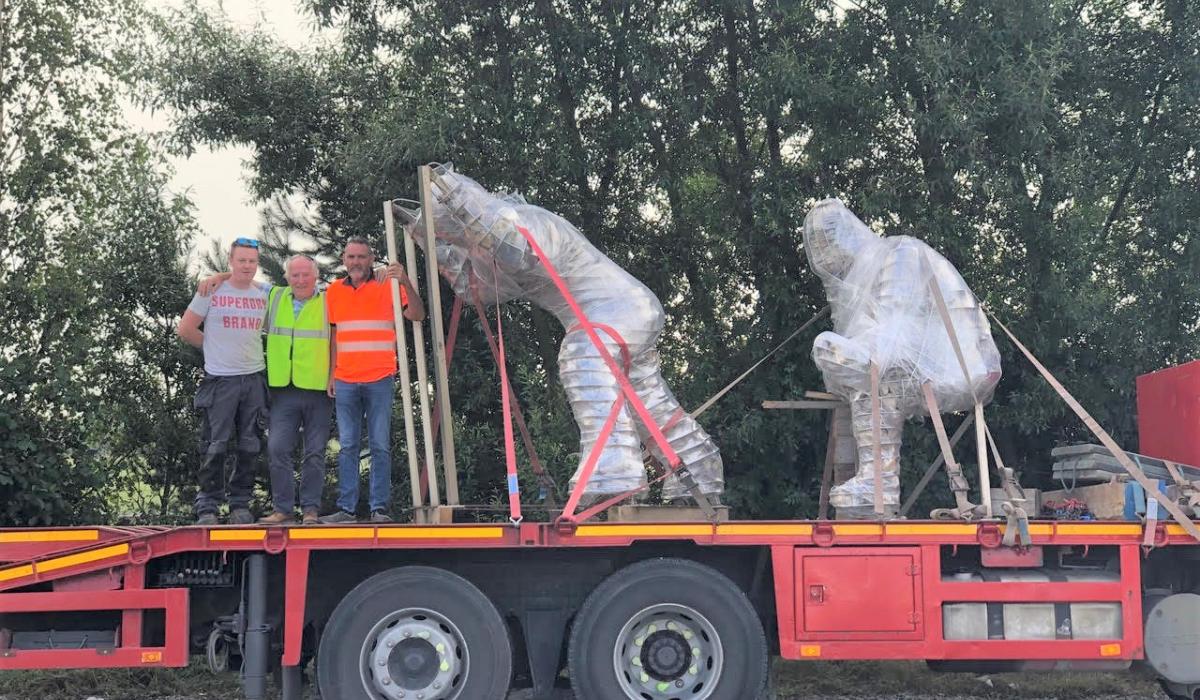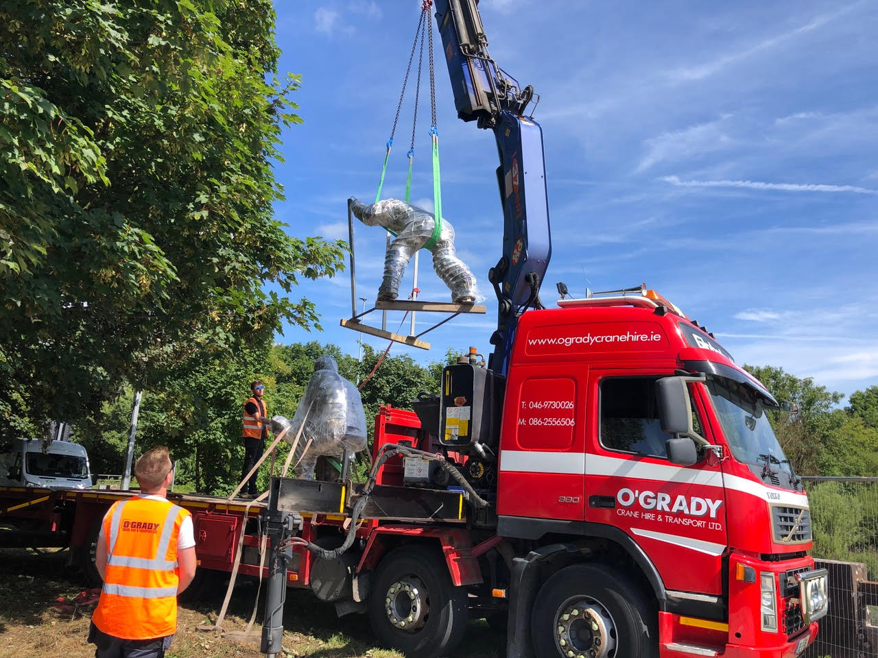 The figures made by Roche are 2.2m high and weigh about a tonne. Sponsor, Tullamore businessman Seamus Kane, owner of Palfinger, assisted with the arrangements for moving them and they were lifted onto a truck (see picture below) by O'Grady Crane Hire & Transport, Clonbullogue.