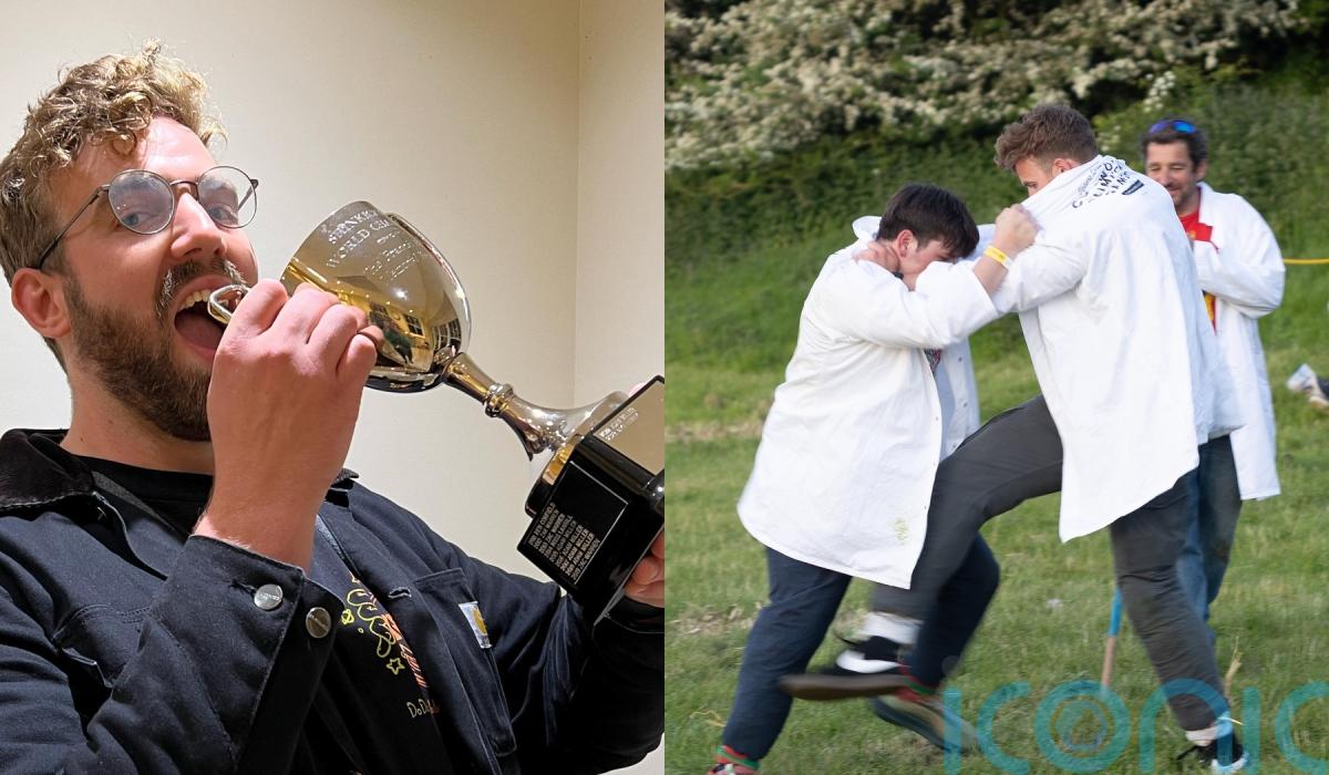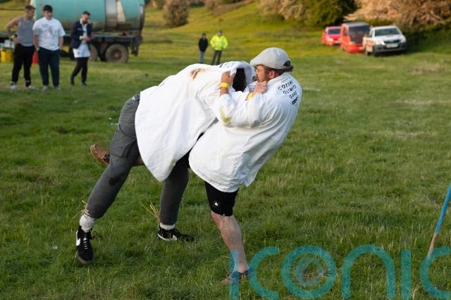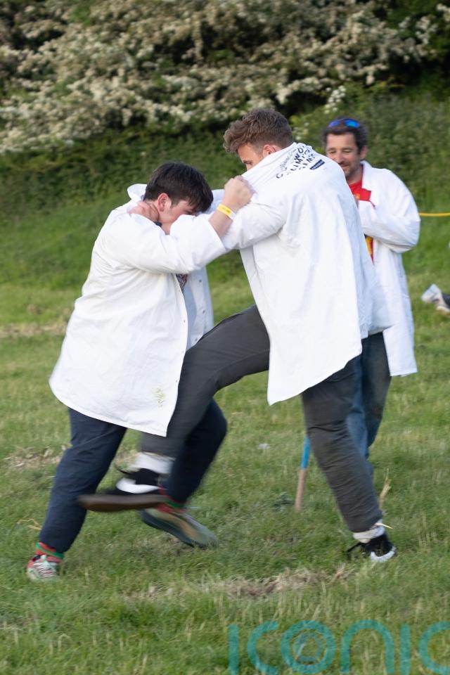 Mike Newby, 34, an account director who lives in Cheltenham with his girlfriend, Geo Legate, 27, competed in the Cotswold Olimpick Games – which celebrates English folk sports and games, such as tug of war, hammer throwing and the main event, shin kicking – on May 31 2024.