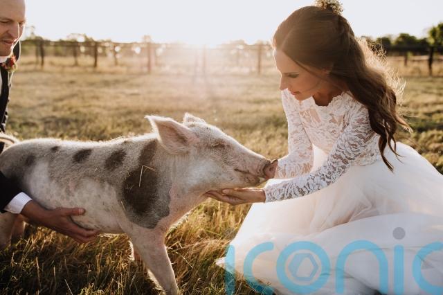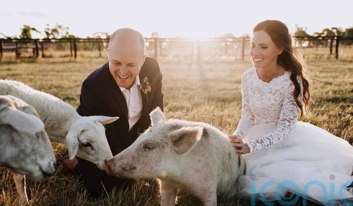 A vegan couple who fell in love caring for rescued sheep and pigs at an animal sanctuary celebrated tying-the-knot this year in a photoshoot with some of their favourite farmyard friends after an intimate mountain ceremony.