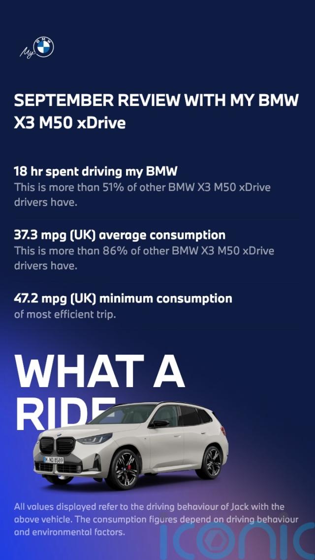 For instance, during the last month, I could see that I managed to travel 622 miles overall, which worked out at 18 hours of time spent behind the wheel of the M50. In fact, that meant that I was driving the X3 for 50 per cent more time than other X3 M50 drivers. Which is nice.