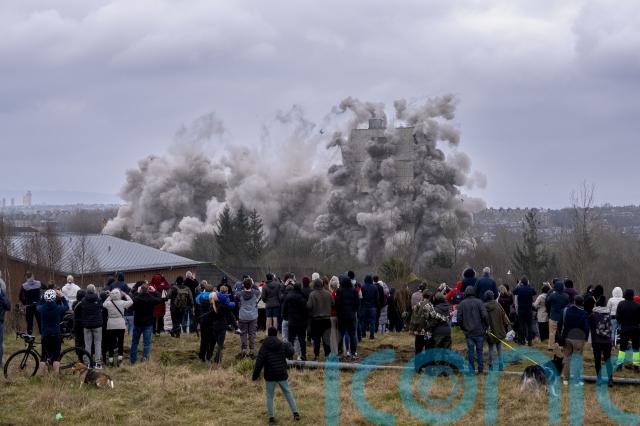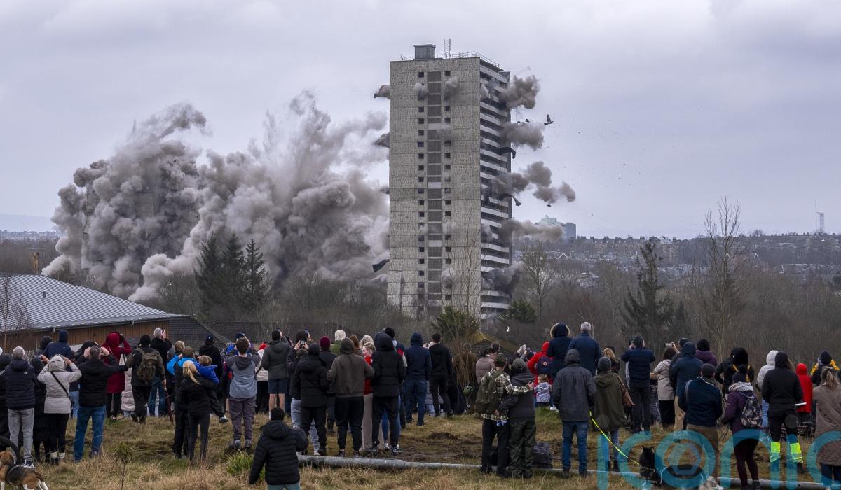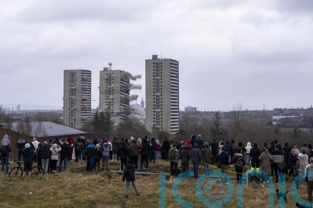 Hundreds of locals have turned out for the demolition of three high-rise Glasgow tower blocks.