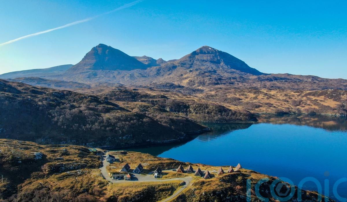 The lodges overlook Loch a’ Chairn Bhain and towards the three-peaked mountain Quinag, which the charity cares for.