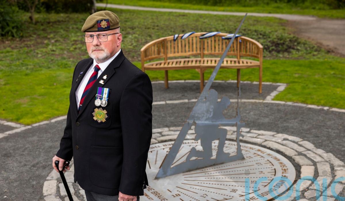 The Shadow Of The Brave, a 5ft steel sundial, is modelled on the silhouette of veteran Bill McDowall, 61, kneeling and paying his respects to his fallen comrades.