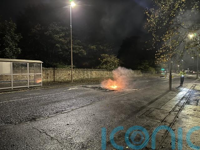 Earlier in the evening, a fire had been lit to block the road to passing vehicles and there were remains of a temporary bus stop strewn in the street.