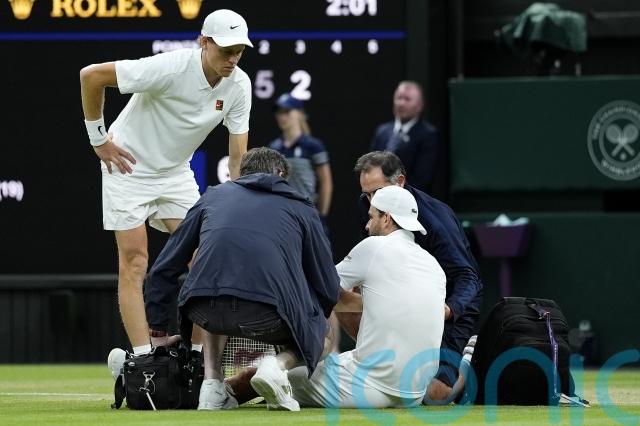 The 19th seed was helped to his feet by two physios and went off to receive treatment, before returning a few minutes later to shake Sinner’s hand.