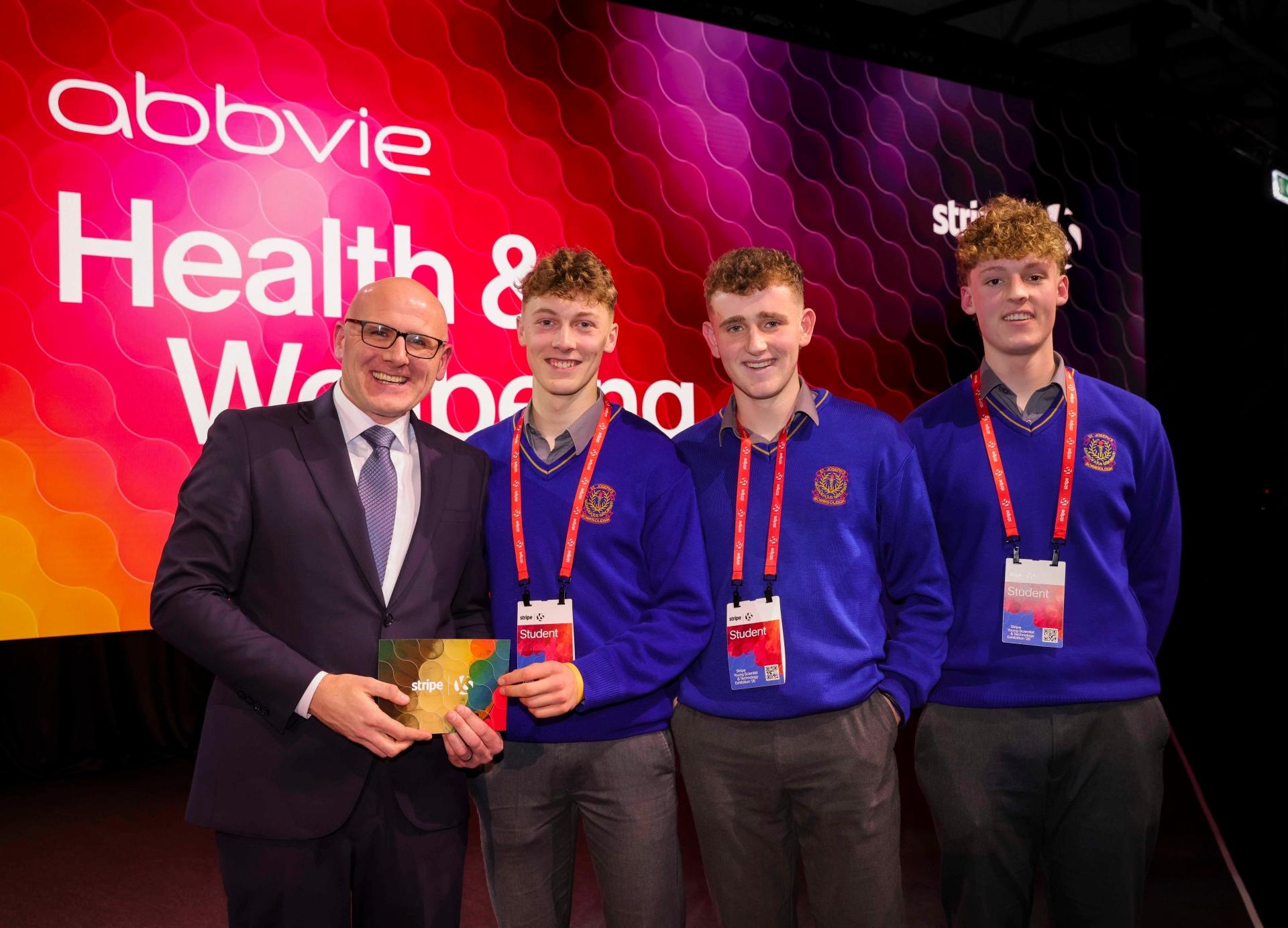 Health and Wellbeing Category, presented by Abbvie.Ray McGrath, Chair of the Judging Panel from Stripe, presents the 2nd Intermediate Group Award to Daniel Groome, Jack Groome and Luke Ryan, from St Joseph’s College, County Tipperary, for the project “Mapping Ireland’s Future ‘Care Gaps’: A Composite Risk Index for Access to Care in an Ageing Population.”