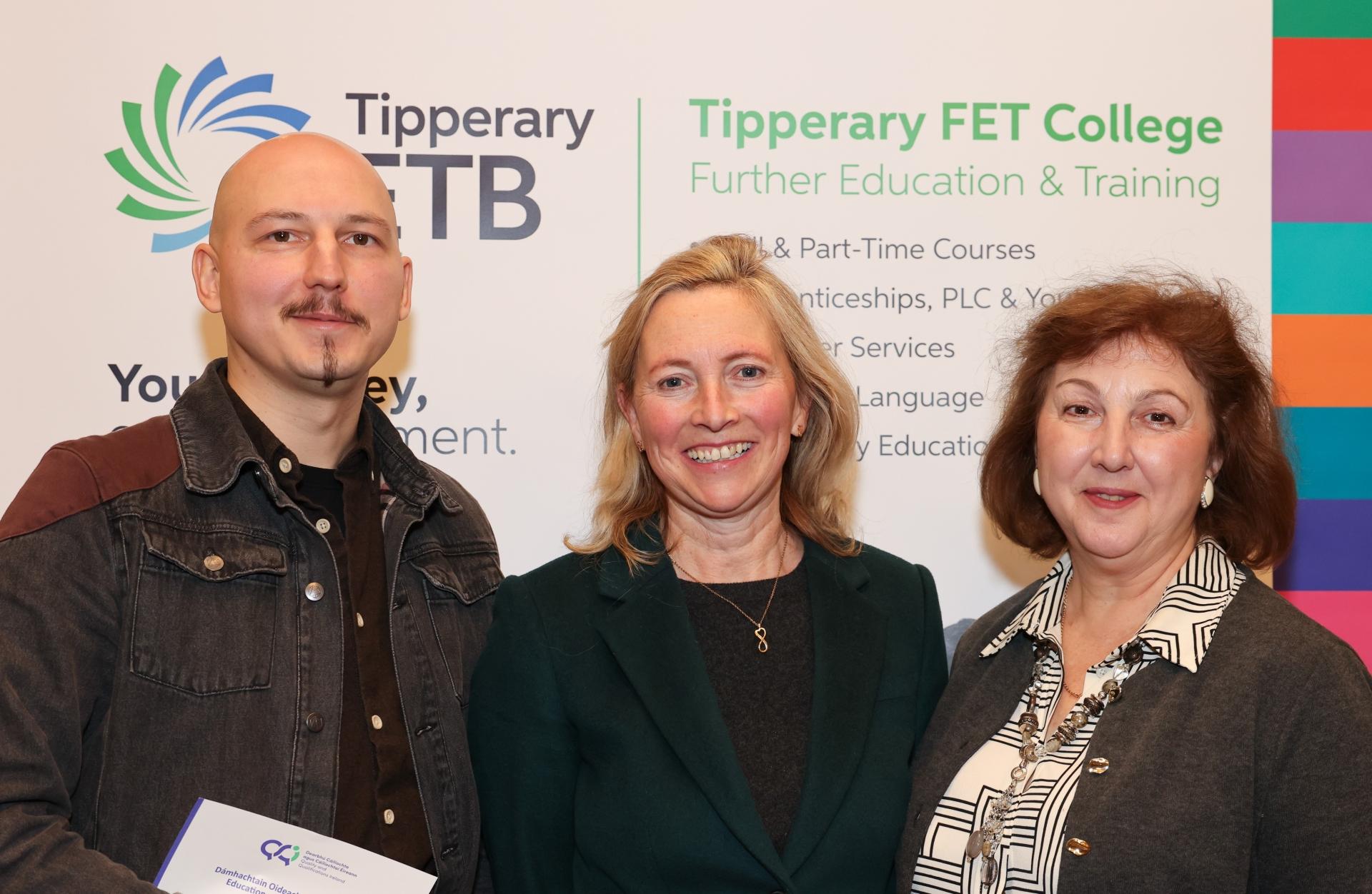 Attending the Tipperary FET College Graduation Ceremony in the Abbey Court Hotel recently: Nikita Ivanov (Left) pictured with his teacher, Breege Corrigan (centre) and his mother Hanna. Nik achieved a top grade in his Leaving Certificate Irish at Tipperary FET College – Nenagh (Kenyon Street) after completing the course in just one year, becoming the first Ukrainian student at the college and more than likely, in Ireland to do so. Nik is currently studying Business Studies - AI for Enterprise at TUS Limerick.