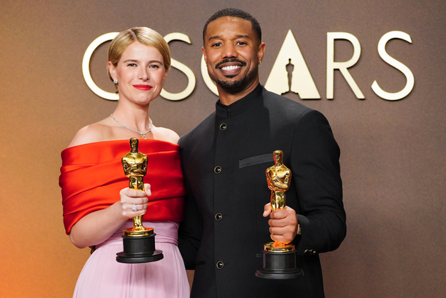 Jessie Buckley, left, winner of the award for best actress in a leading role for "Hamnet," and Michael B. Jordan, winner of the award for best actor in a leading role for "Sinners," pose in the press room at the Oscars on Sunday, March 15, 2026, at the Dolby Theatre in Los Angeles. (Photo by Jordan Strauss/Invision/AP)