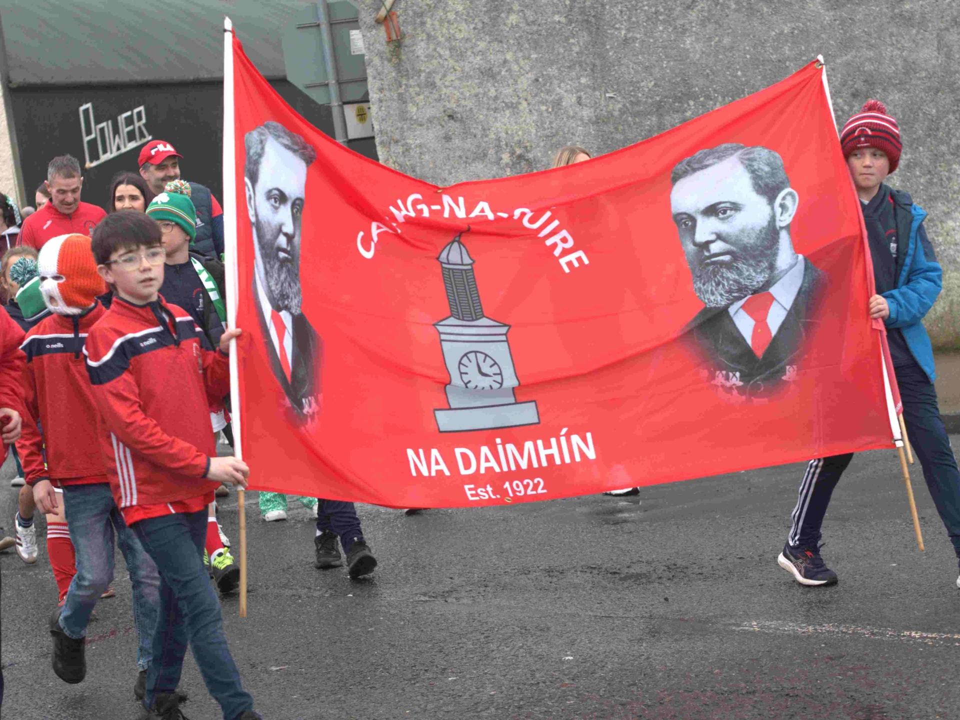 Young members Carrick Davins GAA Club carrying the club banner displaying the portrait of GAA founder Maurice Davin