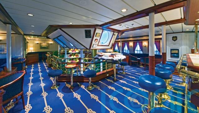 Teak decks, mahogany railings and blue carpet with knot designs all make for a traditional feel to the ship’s decor.