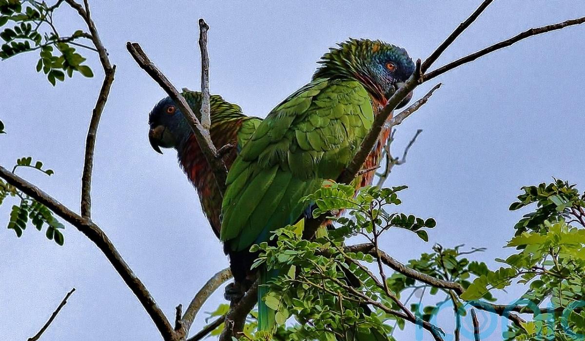 Waiting at the lookout point high in the hills of the rainforest in St Lucia, a fine white mist snaking its way through the lush verdant canopy of trees, we suddenly see a flash of green, crimson and yellow flying across the valley.