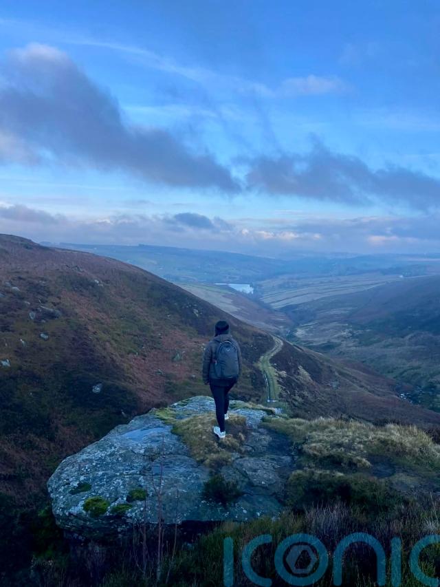 As we reach the final section of the walk, we stop at Ponden Kirk (known as Penistone Crags in the book), a gritstone formation jutting out of the heather-strewn hillside. The views from this location are breathtakingly clear – we can see for miles over the valley and across the county, spotting small villages and towns in the distance.