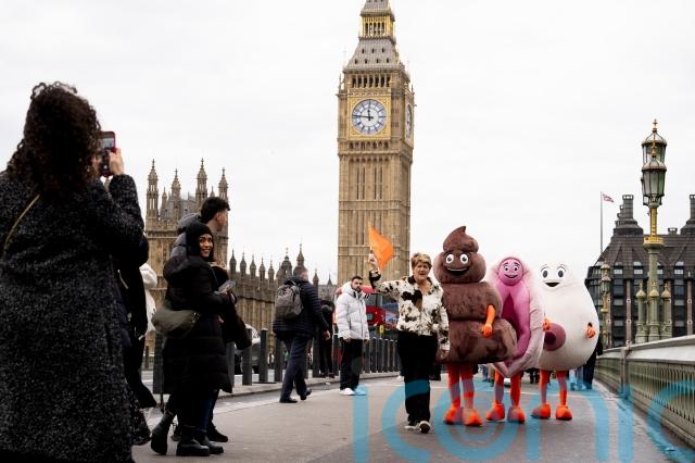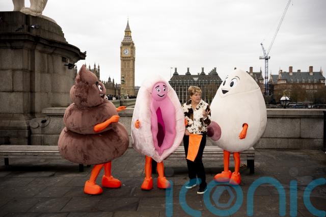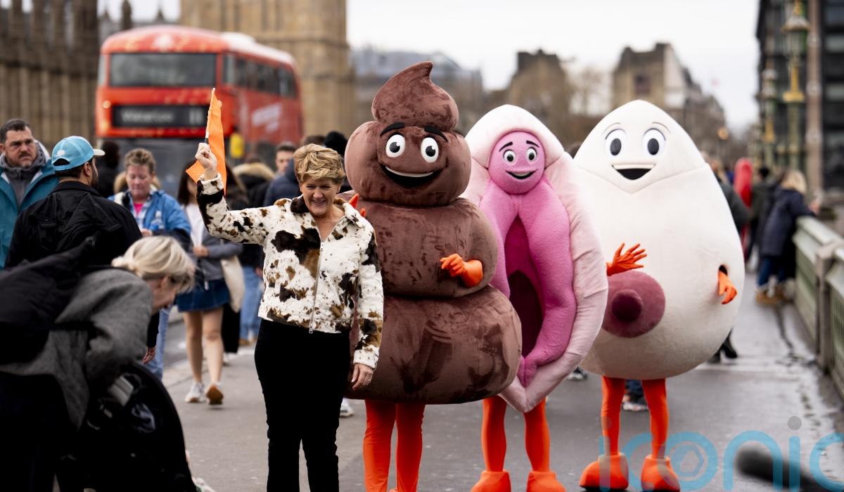 TV sports presenter Clare Balding has led a team of mascots, including a poo, a breast and a vulva, through central London urging people to get up-to-date cancer screenings.