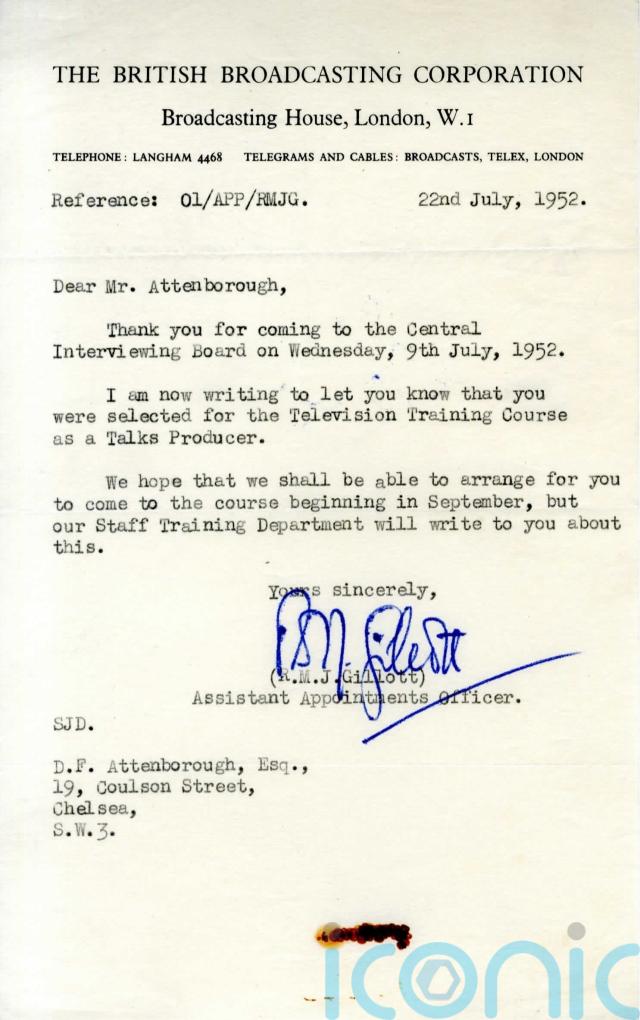 A letter dated July 22 1952, with a letterhead which reads The British Broadcasting Corporation, says: “Dear Mr Attenborough, Thank you for coming to the Central Interviewing Board on Wednesday July 9 1952.