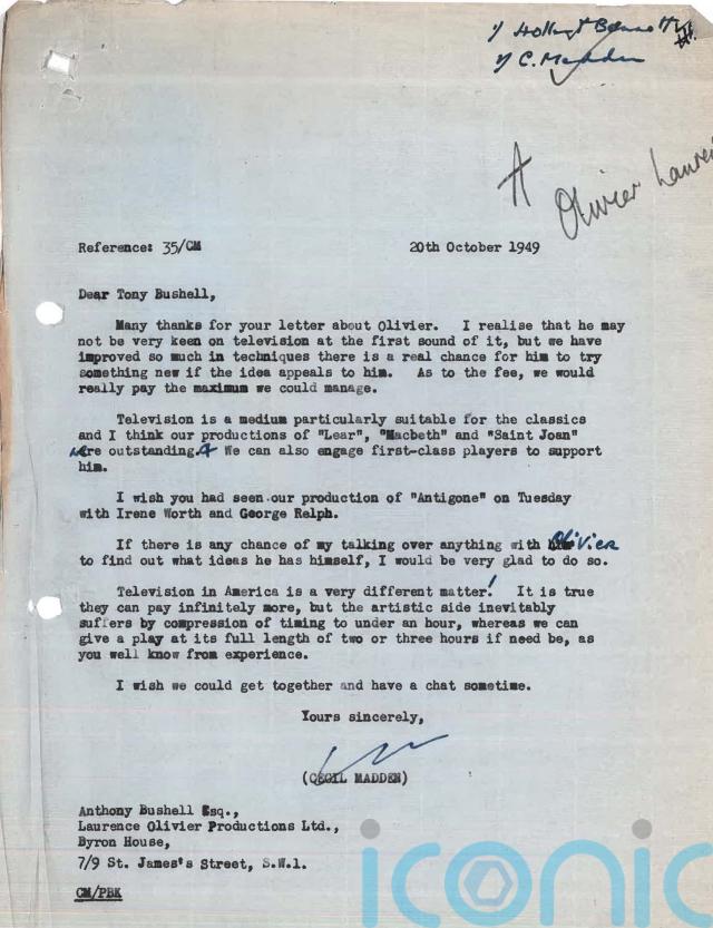 A letter addressed to his business associate, Anthony Bushell, dated October 14 1949, says: “Do, if you feel able, try to persuade Olivier to do some television for us now that he is a little freer after Streetcar. We would put on almost anything he liked and would do it in the best possible manner.”