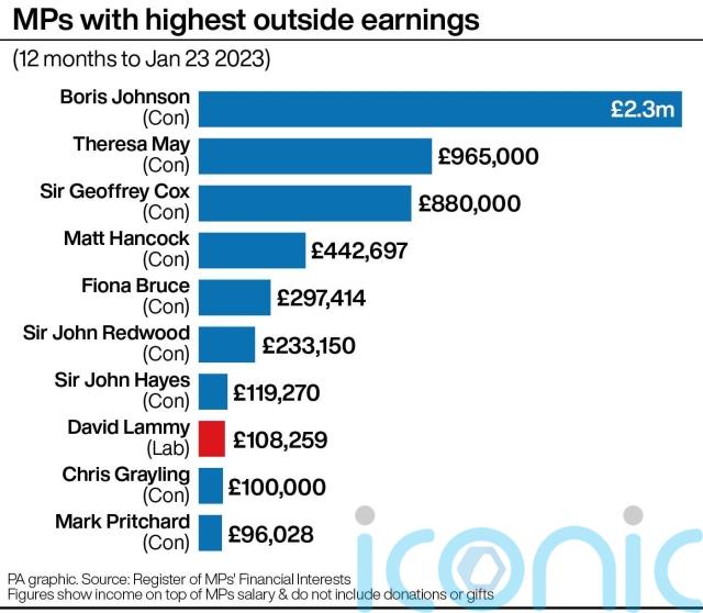 Nine of the top 10 earners were Conservative MPs, with David Lammy the only Labour MP in the top 10, declaring £108,259. This included £48,908 in speaking fees and £53,500 for presenting shows on LBC.