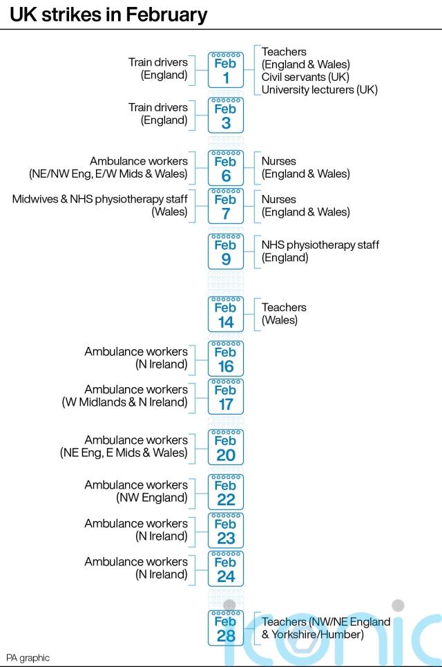 As well as more strikes on Friday by train drivers, London Underground Bakerloo Line workers will walk out on Saturday, while ambulance workers and nurses will launch a fresh wave of industrial action across England and Wales from February 6.