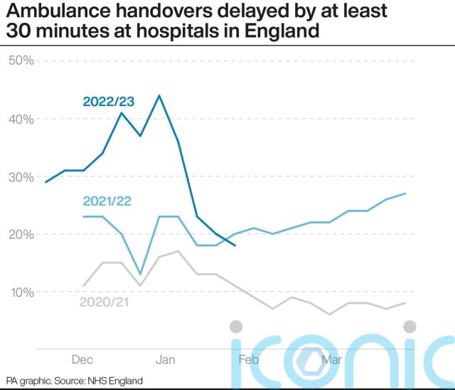 Some 6% of patients waited more than an hour last week to be handed over to A&E teams, compared with 8% at this point in 2022.