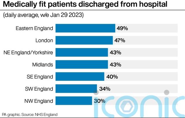 A total of 41% of patients ready to leave hospital last week were actually discharged, though there were wide variations across the regions, with 49% discharged in eastern England and only 30% in north-west England.