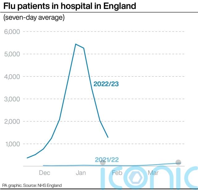 An average of 1,291 people were in hospital with flu each day last week, a decrease from 2,034 the previous week and the lowest since early December.
