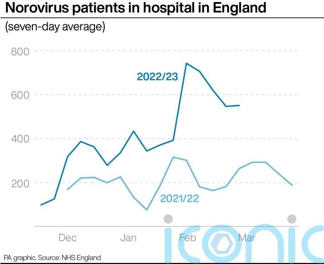 An average of 551 adult hospital beds in England were occupied last week by patients with diarrhoea and vomiting or norovirus-like symptoms, according to NHS data.
