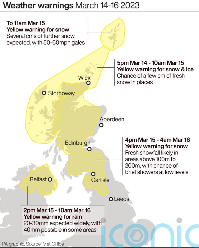 Snow spells were also expected across parts of northern England and Scotland from Wednesday afternoon and into the early hours of Thursday. This would mainly affect areas above 100-200m before turning to rain as milder weather spreads across the UK.