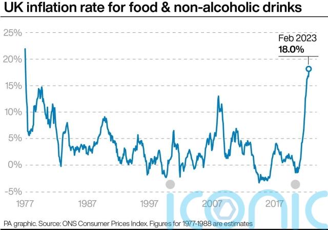 The surprise jump in inflation comes after food and non-alcoholic drinks prices rose by 18% year-on-year last month, up from 16.7% in January and the highest since August 1977.