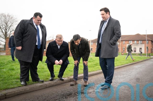 Mr Sunak told broadcasters “today we’re announcing more money for potholes” as he was photographed inspecting a road defect during the tightly controlled Darlington visit.