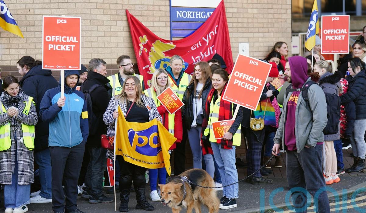 Picket lines are also being mounted outside offices in England at Durham, Liverpool, Southport, Peterborough and London; plus Belfast in Northern Ireland and Newport, Wales.